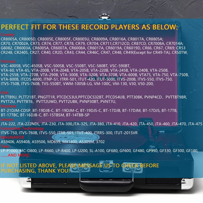 Compatible with More Than 90 Percent New Version Vinyl Record Players, Including Not Limited to Below: Crosley NP1, NP6, CR248, CR27, CR43, CR44, CR46C, CR48C, CR49B, CR49TA, CR49TW, CR50TW, CR53, CR67, CR69, CR70, CR73, CR77, CR78, CR79, CR704, CR711, CR712CD, CR87CD, CR6019A, CR8005A, CR7008A, CR6019A, CR8005A, G6082 ION iCT05RS, iCT09RS, Quick Play LP, Power Play LP, Quick Play Flash, Contour LP, Vertical Vinyl, iLP, Archive LP, Forever LP, Live LP, Pure LP, iLP, Max LP Innovative-Technology ITRR-501, ITRRS-300, ITVS-750 Victrola Nostalgic and suitcase turntable player Jensen JTA222, JTA230, JTA300, JTA380, JTA410, JTA420, JTA450, JTA460, JTA475, JTA22 Tyler Pyle PTCDS8UBT, PLTT21BT, PTCD4BT, PTTCSM70BT, PVTT15UBT Victrola ITCDS-6000, ITRR-501, ITUT-5000, ITVS-200B, ITVS-750, ITVS-750B, ITVS-760B, V50-200, VTA-200B, VTA-220B, VTA-300B, VTA-600B, VTA-750 & VTA-750B VSC-550, VSC-550BT, ITVS-550 & ITVS-550BT models Capehart CRN1, CH196B, CH196R, CH196PK, CH196OR, CH196B, CH196GY, CH196DB, CH196B Boytone BT-17DJB, BT-17DJM, BT-17DJS, BT-19DJB-C, BT-19DJM-C, BT-19DJS-C, BT-16DJB-C, BT-17TB, BT-17TBC, BT-21DJM-CDSP, BT-14TBB-SP, BT-15TBSM Radio Shack 3500, M3100, M3150, M4000, MCD4001, RCT1200, RCT2500, RCT7000 Soundesign 5868, 5869, 5871, 6821, 6822, 6833, 6842, 6846, 6848, 6854 THOMAS PACCONI TCP-MSE825 Teac DC2800, GF30, GF180, GF300, GF600 York Yorx M2408, M2409, M2676, M2202, M2203, M2408, M2409, Q802A CROWN CD2000, MZ1100, MZ2150 Fisher ST141, ST05D, ST707J GRACE DIGITAL GDI-NDL2, GDI-TW3USB, GDI-C2CDRW, GDI-VW00, GDI-VW03, ITC-TWCDRW, Keep Updating