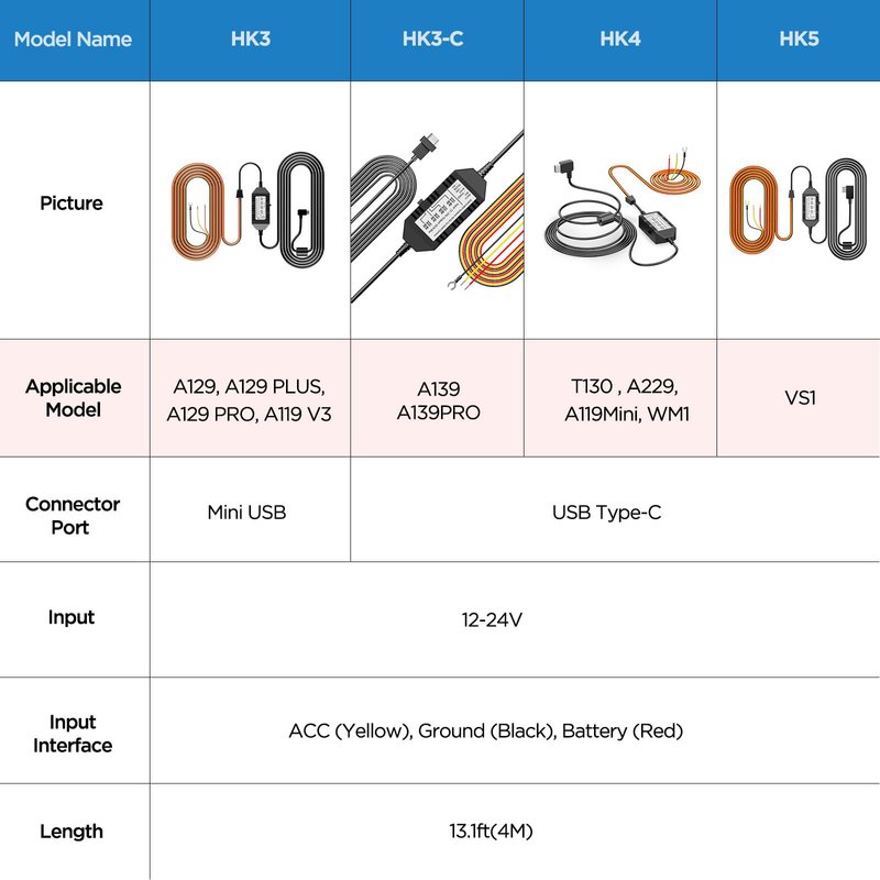 - The hardwire cable length is 13.1ft (4m). The red battery cable should be connected to constant power. The ACC yellow cable should be connected to ignition. The Ground cable should be connected to vehicle body. NOTE: You need to prepare 2pcs fuse tap to work with the hardwire cable. HK4 hardwire kit is for VIOFO T130 , A229Duo, A119 MINI2, WM1, A139Pro dash cam, ISN'T compatible with other series of our dash camera.