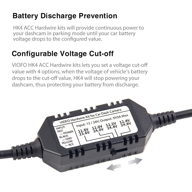 - 【Low Voltage Protection】HK4 hardwire lets you set a voltage cut-off value with 4 options, when the voltage of vehicle’s battery drops to the cut-off value, it will stop powering your dashcam, thus protecting your battery from discharge.