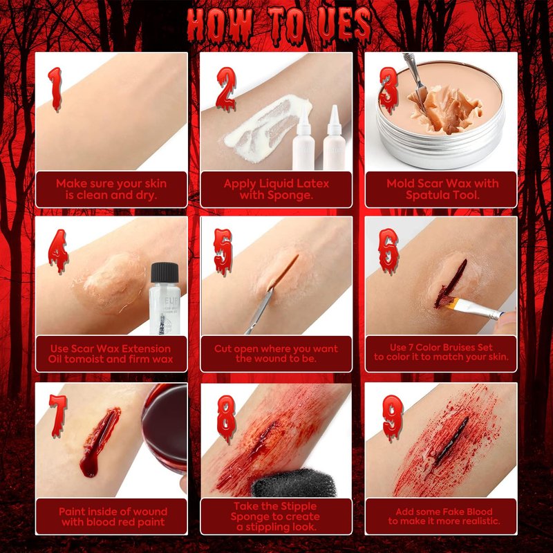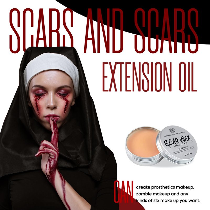 - Scar Wax & Scar Extention Oil - It is not too hard and not too soft, which does not stress the skin, can easily stay on the skin and achieve the desired appearance. Use high quality non-irritating material. Not harmful to the skin. Note: Please use the spatula to scrape it out of the container; Use Scar Extention Oil to make it more sticker on your skin.