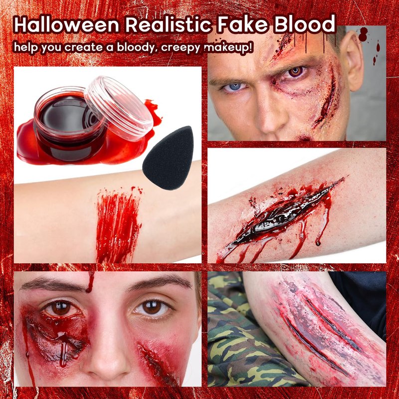 - Realistic Fresh Fake Blood - Super soft and sticky stage blood. Ideal for creating a range of realistic and fresh looking injuries.Excellent pigmentation to create realistic blood flow and consistency. Non-drying fake blood with a syrupy consistency. It continues to drip, so it's great for eye blood, eye drops and nosebleeds. It is safe for mouth and edible.