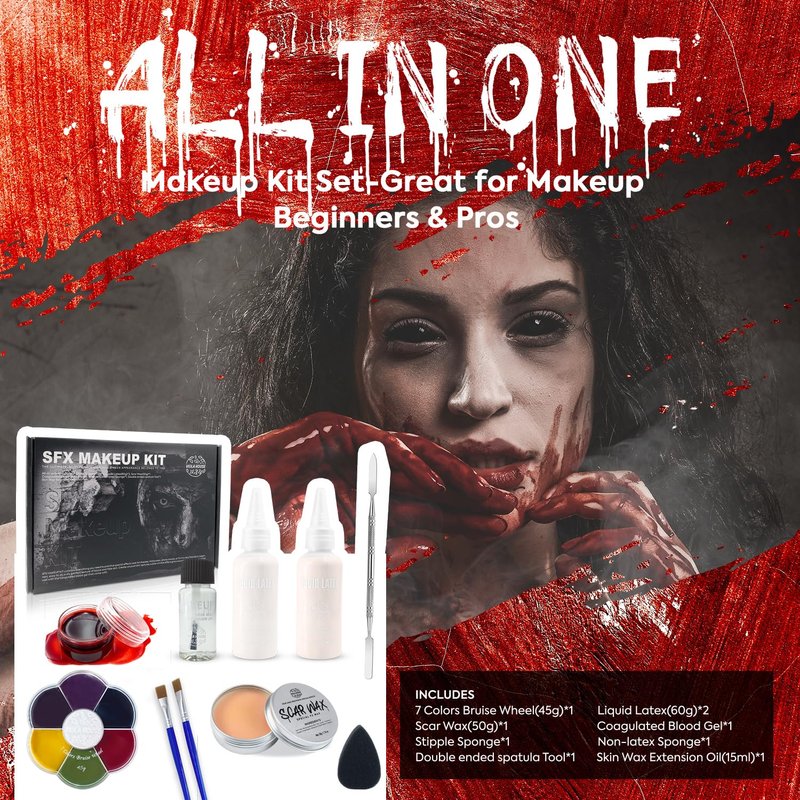 VIOLA HOUSE SFX Makeup Kit, Halloween Special Effects Makeup, 6 Colors Bruise Wound Face Body Paint + Scar Wax + Scar Oil + Liquid Latex + Fake Blood + Spatula + Stipple Sponge + Brush.