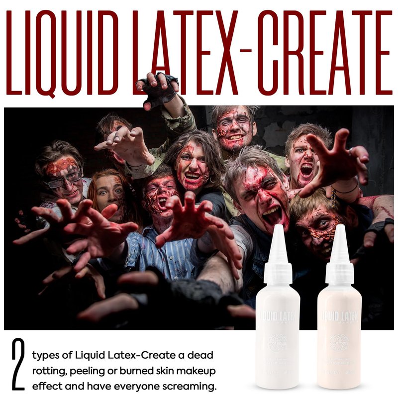 - 2 types of liquid latex - to meet your requirements for different skin colors. Let your imagination and creativity run wild. This liquid latex makeup kit is just what you need to shock and scare everyone! Create a makeup effect with dead, rotting skin that will make everyone scream. People will have a hard time even looking at you! The ultimate scary Halloween look is yours.