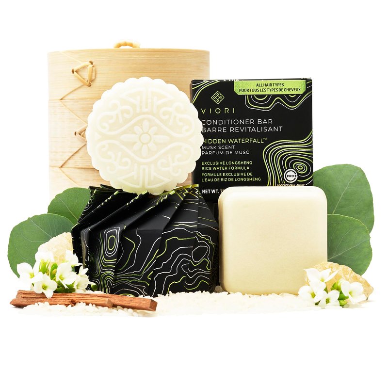 Viori Hidden Waterfall Shampoo and Conditioner Bar Set and Bamboo Holder - Made with Rice Water for Hair Growth - Handcrafted Sulfate Free Shampoo and Conditioner
