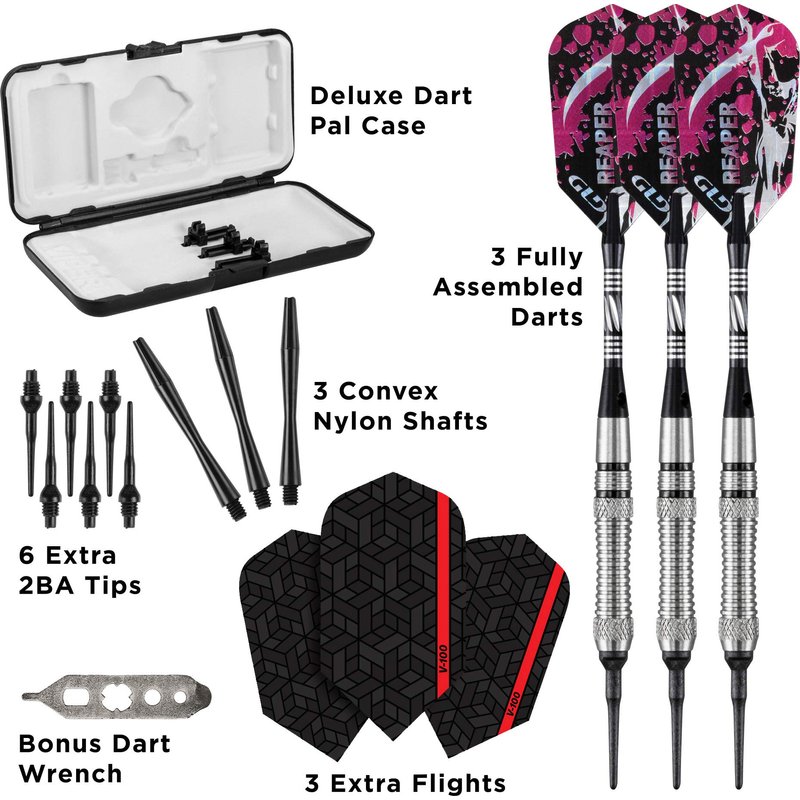 - Includes an additional set of convex nylon shafts, flights, flight protectors, 2BA dart points and a dart mechanic wrench; Each soft tip dart weighs 18 grams
