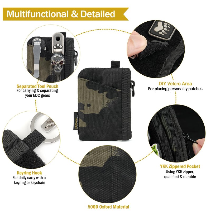 VIPERADE VE17 Small EDC Pouch, EDC Pocket Organizer with DIY Patch Area, Mini EDC Pouch with Zipper Pocket, Small Card Pocket, 2 Slots Pocket for EDC