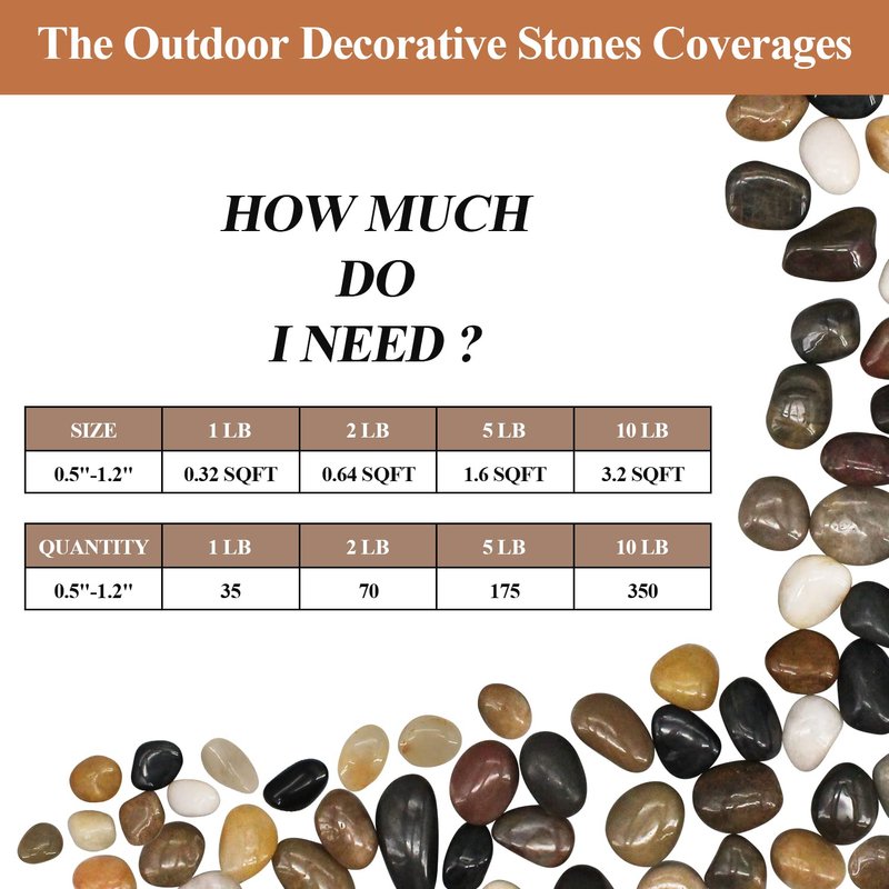 Size and Quantity of VIREKM Outdoor Decorative Stones: The Outdoor Decorative Stones are packaged into 1 pound and 2 pounds when they are packed. 1 pound has about 45 stones, and 2 pound has about 90 stones. The size of the Outdoor Decorative Stones is about 0.5 to 1.2 inch.