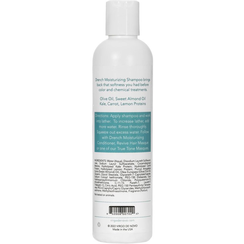 Drench Moisturizing Shampoo Moisture. Color Protect. Vegan. Drench your hair with moisture while gently cleansing. Perfect for hair that is dry, brittle and damaged. You will be amazed at how soft your hair feels after the first use. Free of sulfates, sodium chloride, and parabens. Drench is a great choice to maintain the life of keratin treatments and hair extensions.