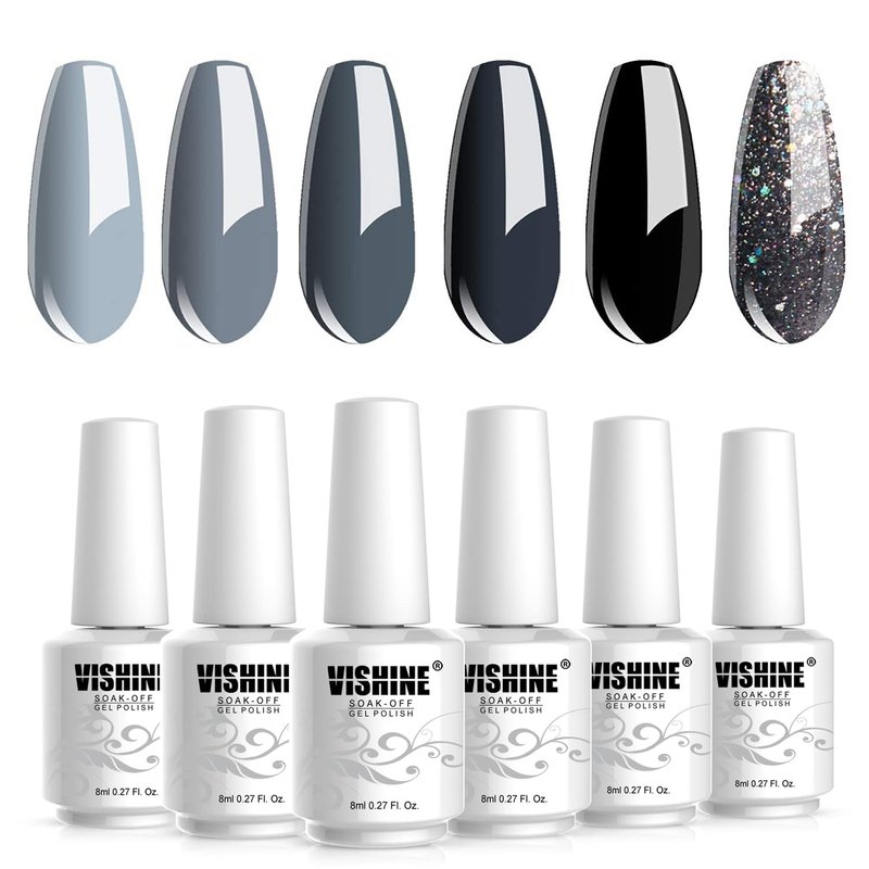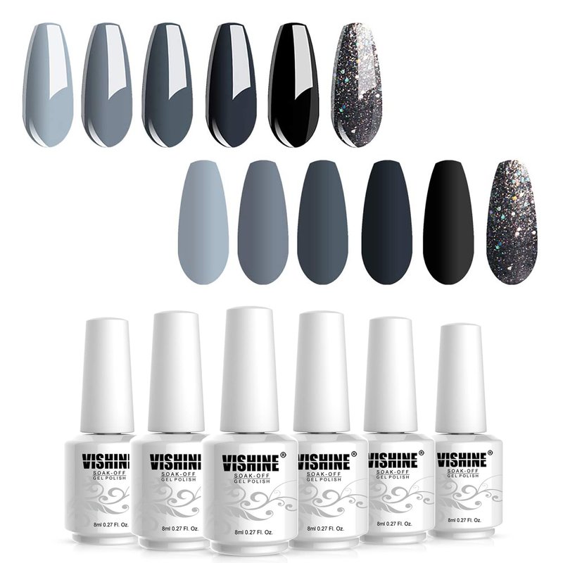 Vishine Classic Gray Serie Gel Nail Polish Set - 6 Different Gray Shades Glitter Gel Polish Kit Popular Nail Art Design Soak Off LED Lamp Nail Polish Gel Manicure Kit