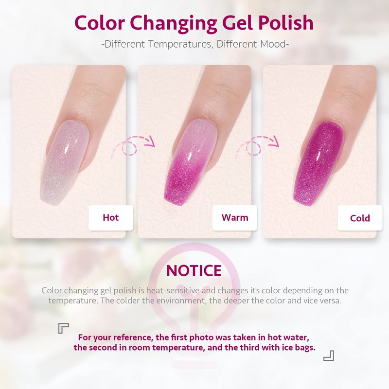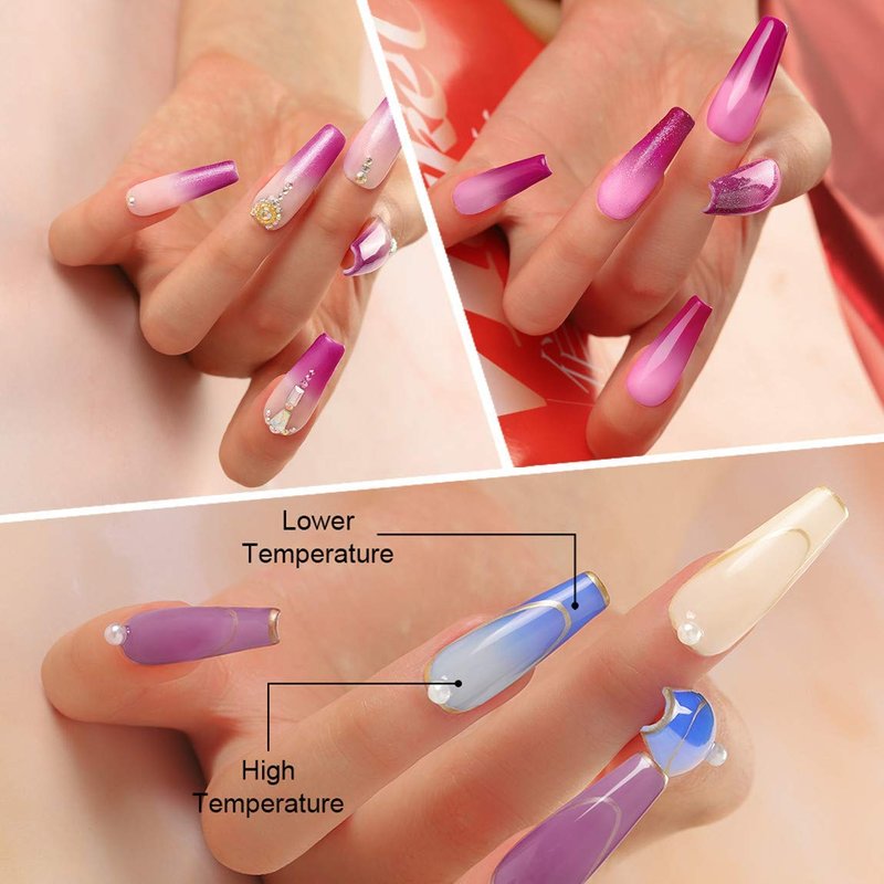 - 【FANTASY TEMPERATURE COLOR CHANGEING】This gorgeous color gel temperature change gel,after applying the temperature is more than 33℃ or less than 18℃,the gel will present different colors,like color magic,when the temperature is high for light colors,when the temperature is low for dark colors,nails due to temperature change,mood due to color and beautiful.