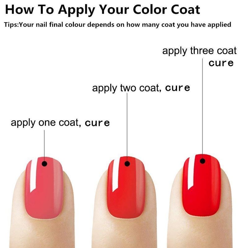 3. Gel polish: Apply first thin layer of color gel polish and cure under UV/LED lamp for 90-120 seconds. Apply the second or third layer color gel polish.