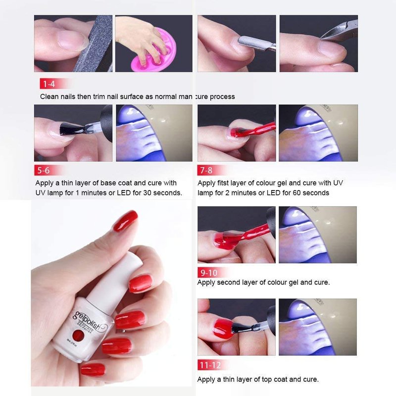 - REMINDER: Nail gel polish need cure under LED/UV light ,CURE TIME: Average for LED light 30-60 secs, UV light 2-4mins.