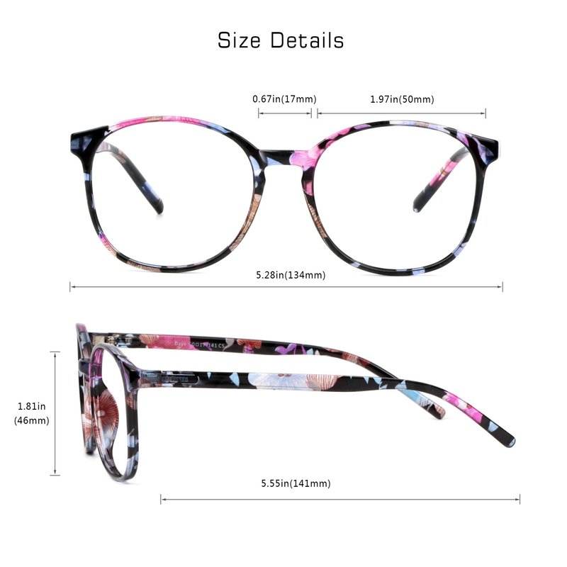 - Material:10g, ultra lightweight, frame TR90, no pressure on ears for long time wearing. Lens Resin. Oval shaped frames with a floral pattern, crafted from lightweight yet durable TR90