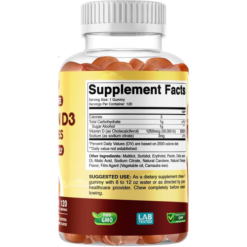 Vitabod Sugar Free Vitamin D3 50,000 IU Weekly Supplement - 120 Vitamin D Gummies for Bones, Teeth, and Immune Support - Easy Chew Pure Vitamin D3 50000 IU- Non GMO Pills