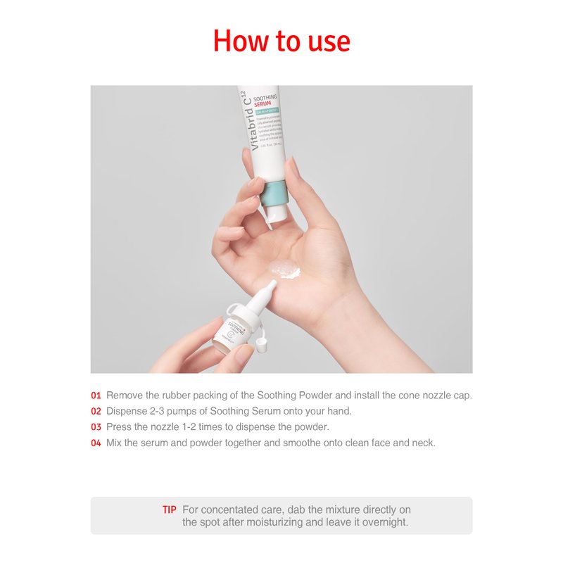 - EASY AND EFFECTIVE APPLICATION: Remove the rubber packing and attach the cone nozzle cap. Dispense 2-3 pumps of Soothing Serum into your hand, press the nozzle to add powder, mix, and apply evenly to the face and neck for comprehensive coverage and effective treatment.