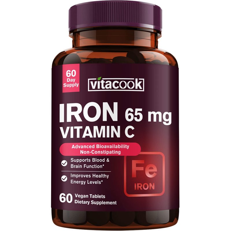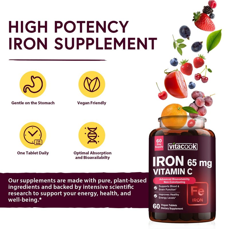 - High Potency and Gentle on the Stomach Iron Supplement for Women Men*: Our formula contains carbonyl iron as it features highest purity (> 98% iron content) and bioavailability. Vitacook Iron with Vitamin C is vegan friendly, and each tablet is formulated with 65 mg of elemental iron and 250 mg of vitamin C. Take one easy-to-swallow tablet daily, and it helps build your iron levels and address iron deficiency while being gentle on the stomach.*