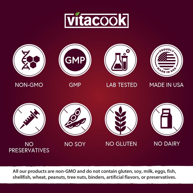 - Pure & Exceptional Products: Our supplements are made with pure, plant-based ingredients and backed by intensive scientific research to support your energy, health, and well-being.* They are non-GMO and do not contain gluten, dairy, soy, artificial colors, and preservatives. All Vitacook products are lab tested for purity and quality and made in USA in a GMP-audited facility. We take our time to provide the best nutritional supplements possible for you and your family.
