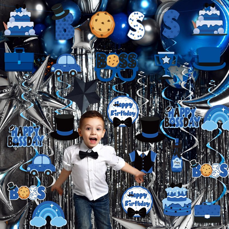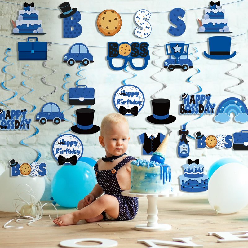- Widely Applicable: these blue and black baby party decorations for boss set features day cutout, hanging swirls, and banners, which is suitable for birthday parties, home decor, family gatherings, and more, you can also apply them as photo props for memorable snapshots