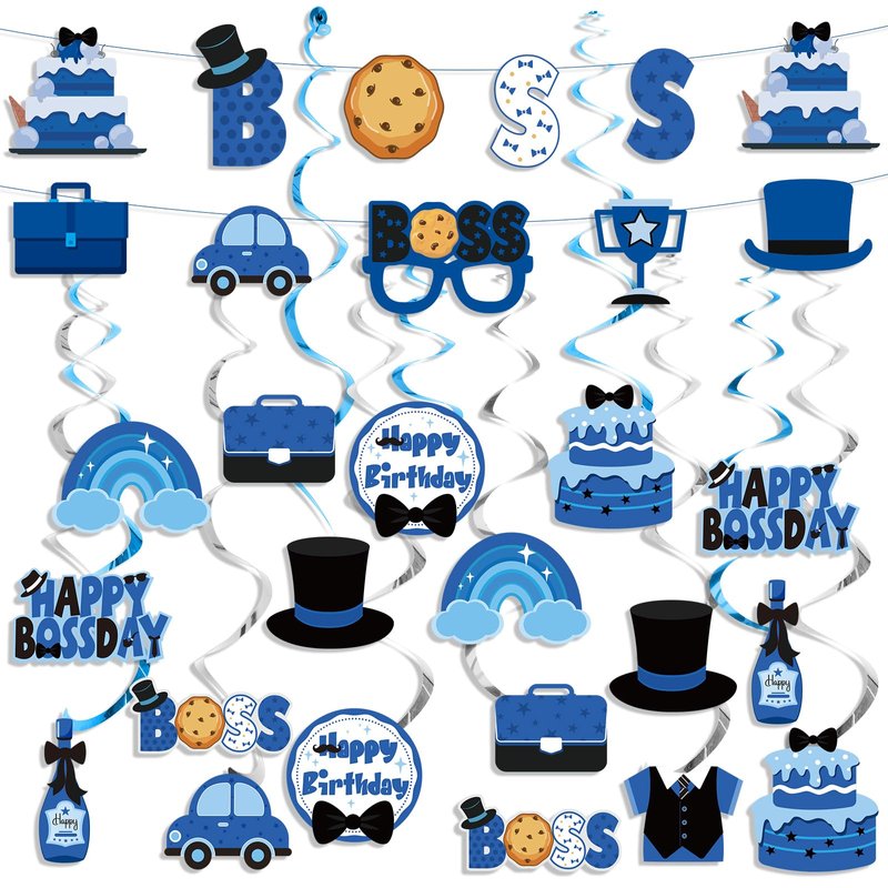 VitalCozy 38 Pcs Boss Birthday Hanging Decorations Boy Birthday Hanging Swirls and Banners Ornament Happy Employee Baby Shower Hanging Decorations for Birthday Party Supplies