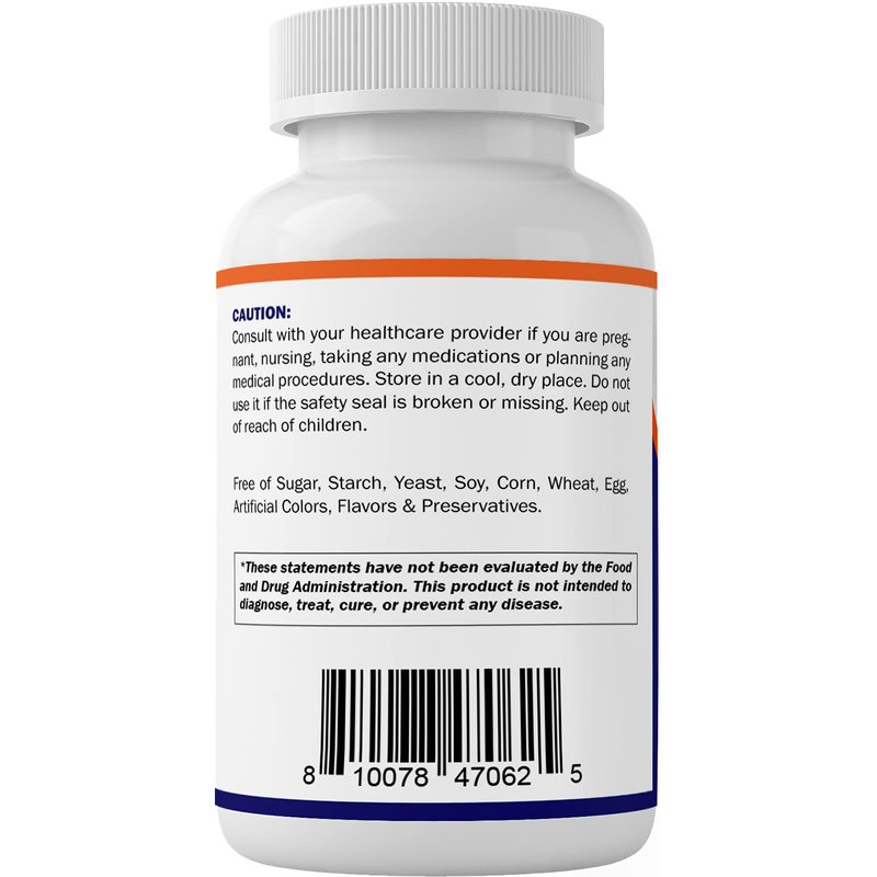 - Free of sugar, starch, soy, yeast, corn, wheat, egg, artificial color, flavor & preservatives.