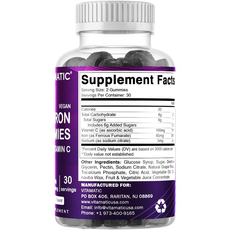 - DELICIOUS NATURAL GRAPE FLAVOR TASTE of Vitamatic Iron Gummies - Avoid consuming large Iron Capsules, Tablets or Pills which gives unpleasant after taste & can not go down easily
