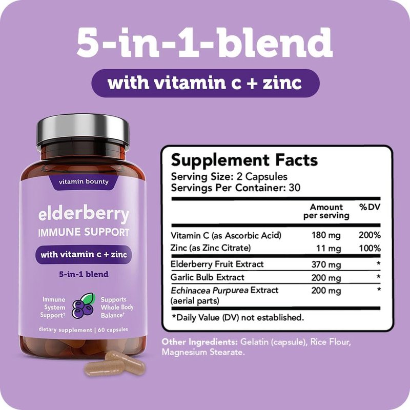 - ELDERBERRY 5-IN-1 BLEND - Elderberry extract capsules are formulated with Vitamin C, Zinc, Echinacea & Garlic. Echinacea & Garlic are natural compounds that help to support healthy immune function