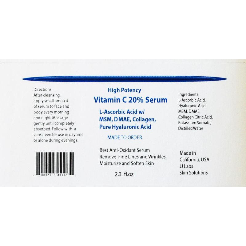 JJ Labs Skin Solutions's Vitamin C 20% serum with MSM, DMAE, Collagen, and Hyaluronic Acid is ideal for all skin types looking to revitalize and help their skin LOOK and FEEL years younger by getting rid of age spots and wrinkles! Reduce the depth and amount of wrinkles with MSM and DMAE, while they also get rid of age spots and tighten your skin to reverse the inevitable sagging associated with old age. The collagen also serves to firm and strengthen your skin! The vitamin C enhances the benefits of collagen and wrinkle-fighting ingredients, helps your skin recover from environmental damage, and protects it from future damage. Studies highly recommended applying Vitamin C onto the face daily to protect against UV-induced cell damage that can cause premature aging. Hyaluronic Acid moisturizes your skin, which prevents water loss and protects your skin from dirt and other pollutants. The loss of natural hyaluronic acid is one of the most common causes of wrinkles, so the idea of putting HA back into the skin to repair wrinkles makes sense as it can hold up to 1000x its weight in water!