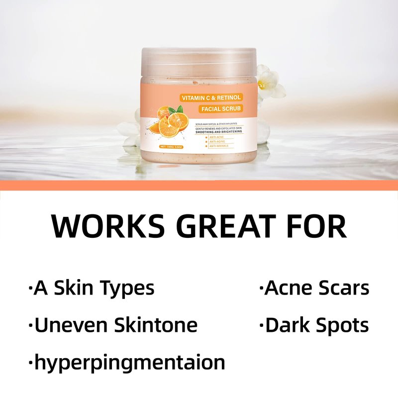 - EXFOLIATING FACE SCRUB: Don't Damage Your Skin With Harsh Scrubs. Most exfoliators tear and damage your skin. Our vitamin C and retinol scrub for skin repairing gently helps loosens dirt, grime, and dull skin.
