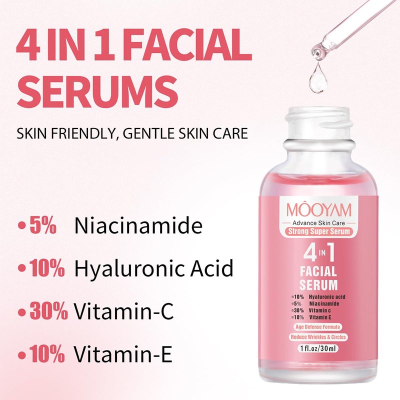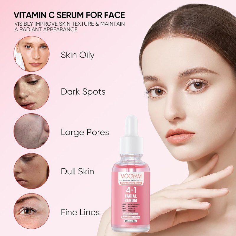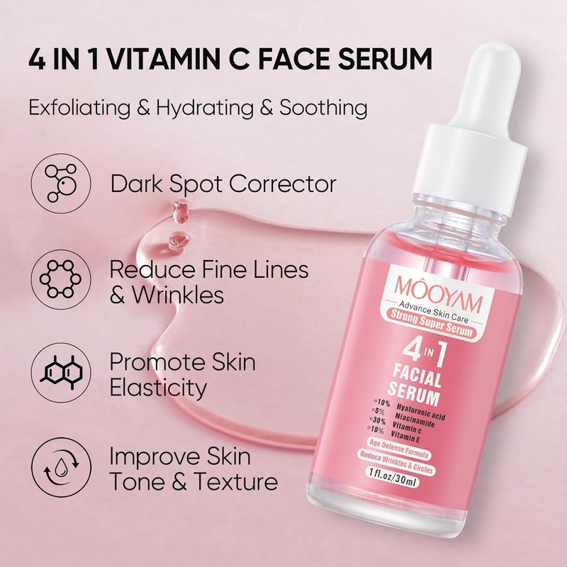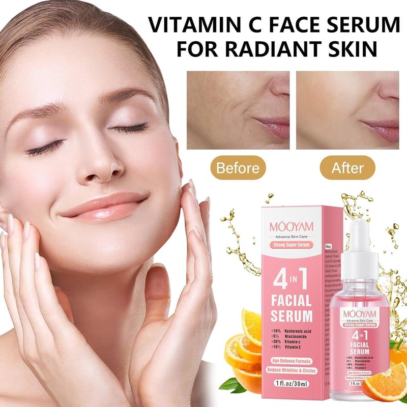 - 4 IN 1 VITAMIN C FACIAL SERUM:This face serum is your all-in-one solution for radiant and youthful skin. Combining the potency of Vitamin C, Hyaluronic Acid, Vitamin E, and Niacinamide, it takes on common skincare concerns. Simplify your skincare routine with our Vitamin C Serum - brightening, hydrating and protecting your skin, all in one bottle.