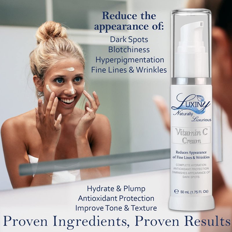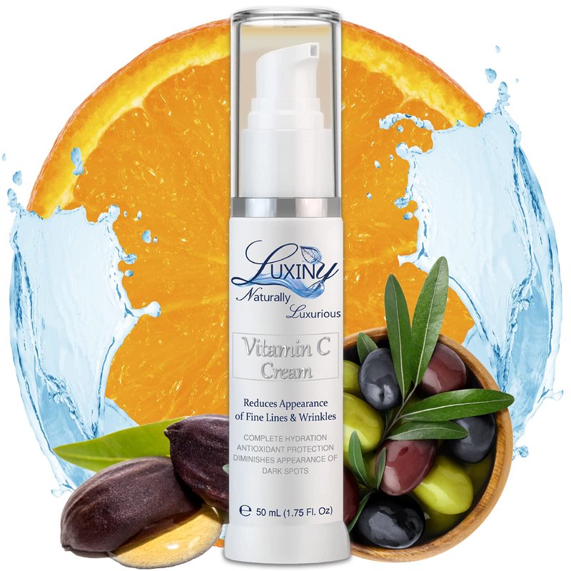 VITAMIN C - NATURE'S BEST KNOWN SECRET TO ACHIEVING HEALTHY RADIANT SKIN! For many of us, recent advancements in the science behind skincare regimens meant to improve our skin care routines, instead have made choosing the right product exhaustively complicated and often expensive. No worries, Luxiny’s team of Specialists sorted through the chemistry behind these advancements and created the best face moisturizer for men and women available on the market today. How can we be so confident it's the best face moisturizer for women & Aging Defense skin care issues? The best moisturizer for the face? How do we know it's a great facial moisturizer for oily skin, dry skin, & a good sensitive skin moisturizer? Simple. It has Vitamin C. Scientists have known for decades, to achieve optimal health our diets need to include foods rich in vitamin C. Vitamin C’s health benefits are numerous, including that it is a strong antioxidant that can protect our body and our skin from the effects of aging and damage caused by over exposure to the sun.* Our natural face moisturizer – Luxiny Vitamin C Cream - contains a stabilized form of Vitamin C to help reduce wrinkle formation and brighten age spots along with a blend of rich emollients to nourish the skin. Nourishment that over time and with consistent use has proven to help with hyperpigmentation treatment and act as an powerful wrinkle cream. Luxiny’s Vitamin C facial cream is the wrinkle cream that really works! * Always apply sunscreen with SPF 30 before exposing your skin to the sun. **All Luxiny products are made in the USA in a cruelty-free FDA inspected and cGMP/SOP compliant facility. This is a paraben free lotion with no dyes, phthalates, sulfates, or drying alcohols. Luxiny Vitamin C cream is a fragrance free face moisturizer.