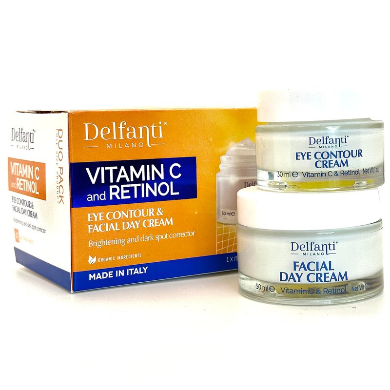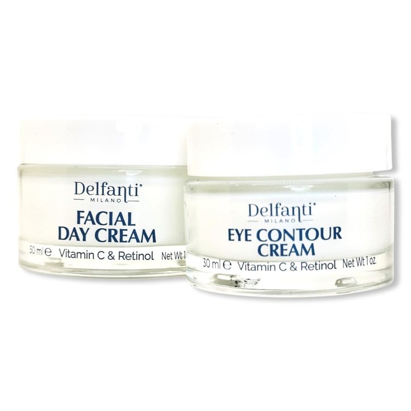 DELFANTI Eye Contour Cream and Anti-Aging Day Cream are a powerful combination of Vitamin C and Retinol, a dual action to brighten the appearance of your skin with an anti-aging effect. DELFANTI Duo reinforces the powerful visual actions of natural actives and precious oils. Studies on Retinol report its strong effect on stressed and dull skin, improving and normalizing the appearance of skin renewal Results: skin appears more even, radiant and adequately hydrated. Vitamin C: is an excellent active with cosmetic - brightening and toning action. Retinol: also called "the beauty vitamin", has - important regenerative properties. TO USE EYE CONTOUR CREAM Apply to the eye contour area, avoiding direct contact with the eyes. It is recommended to combine with DELFANTI Face Cream. For external use only. DAY FACE CREAM Apply every morning to clean face and neck, avoiding direct contact with the eyes. For external use only, In case of intense sun exposure, follow with SPF protection.