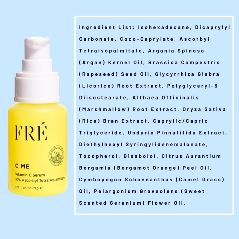 Vitamin C Brightening Serum: FRÉ's C ME is a Vitamin C concentrated waterless formula made of 10% VC-IP, an advanced formulation of Vitamin C, to dramatically brighten the appearance of skin, reduce dark spots and pigmentation, and smooth fine lines. Supercharge your mornings and evenings with this velvety soft serum and its unique geranium and citrus scent. It's a daily must-have for strong, healthy skin. 1.01 Fl oz.