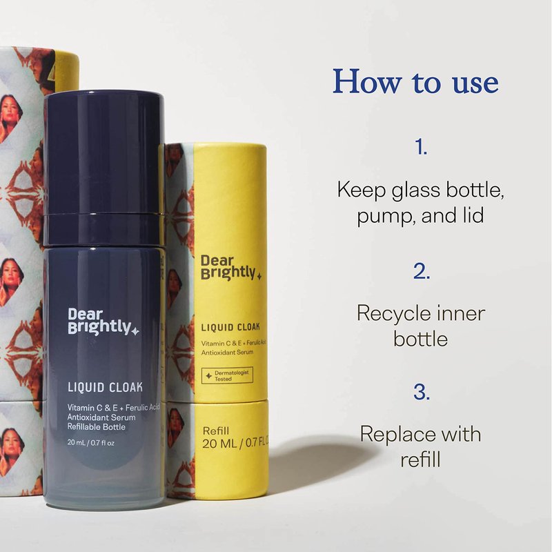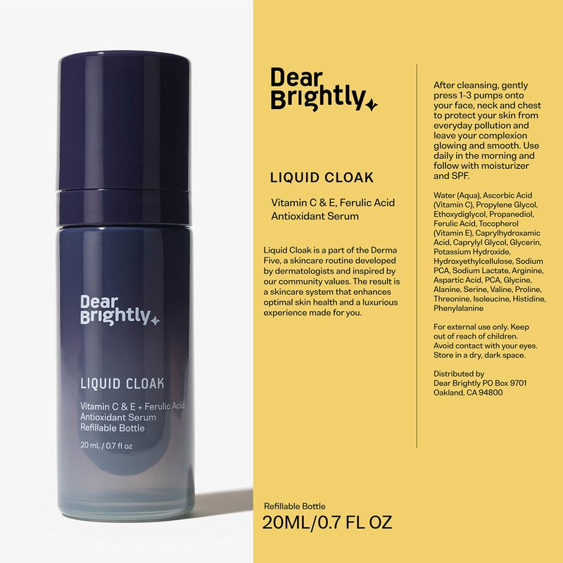 Meet your new bff. Help protect from sun damage, hyperpigmentation, and premature collagen degradation with our Liquid Cloak Serum. Our skin encounters oxidative stress daily, which can lead to premature skin aging. Vitamin C is the most abundant antioxidant in human skin, but we can’t synthesize it on our own. Applying Vitamin C can boost our skin’s natural cell-protecting abilities. Not all Vitamin C formulas are created equal–this formula contains Ferulic Acid & Vitamin E antioxidants to maximize stability, aid in collagen synthesis, and double its protective qualities. In the morning, apply Milk Tower cleanser, Liquid Cloak serum, Skinship moisturizer, and lastly NeverSkip sunscreen, for smooth, supple skin. - Specially designed to protect and restore your skin - Absorbs quickly and layers well with other products such as makeup - Dermatologist tested - Alcohol, Fragrance, Phthalate, and Paraben Free - Cruelty-Free - Sustainable & refillable glass bottle with an airless mechanism for minimal oxidation & maximum stability Key Ingredients: - 15% L-Ascorbic Acid: A potent level of the chemically active form of vitamin C - Vitamin E + Ferulic Acid: Antioxidants that complement vitamin C, making it more stable and doubling its photoprotective qualities - Amino Acids: The building blocks of all proteins, like collagen and elastin Dear Brightly is on a mission to close the gap between dermatologists and everyday people. Protect and restore your skin with Liquid Cloak. Make Liquid Cloak an essential part of your daily Derma Five routine.