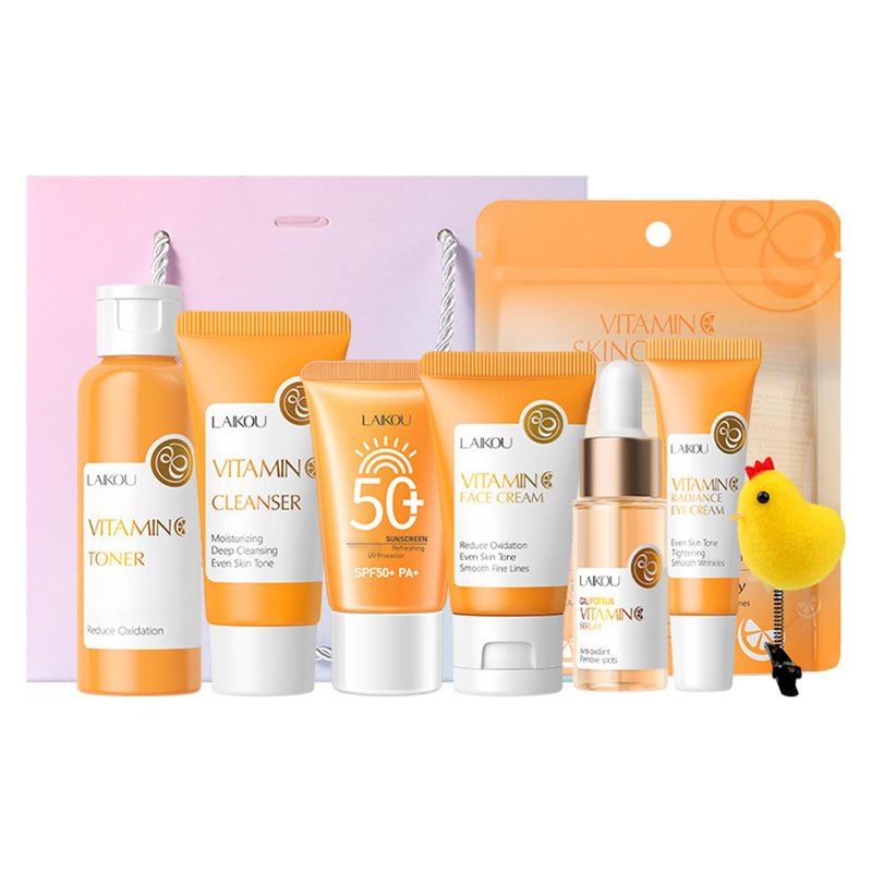 Vitamin C Skincare Set, facial cleanser, toner, face serum, face cream, eye cream, sunscreen, hairpin, Gift bag