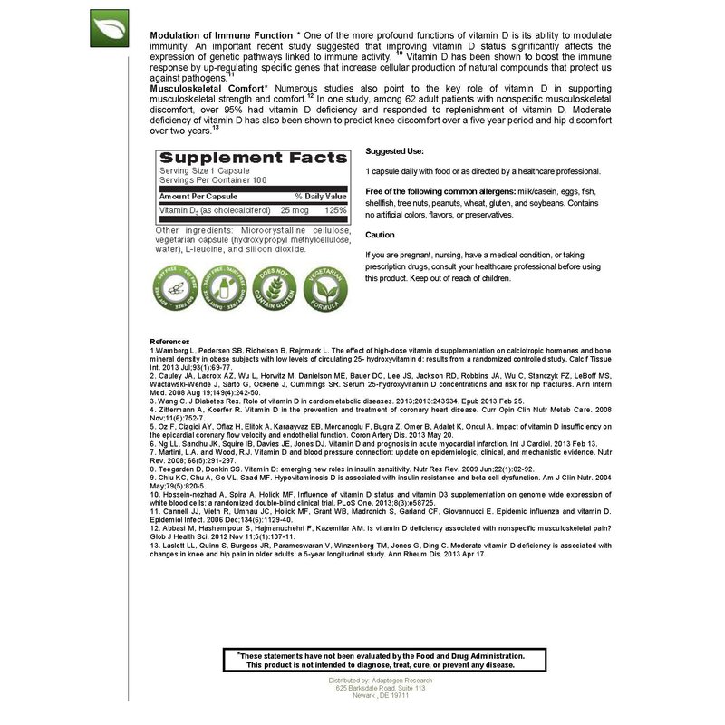 Vitamin D3 1,000 IU High Potency | Vitamin D 1000 (25 mcg) Supplement for Healthy Bones Muscles | Hypoallergenic Supplement for Enhanced Vitamin D Absorption | 100 Vegetarian Caps |Adaptogen Research