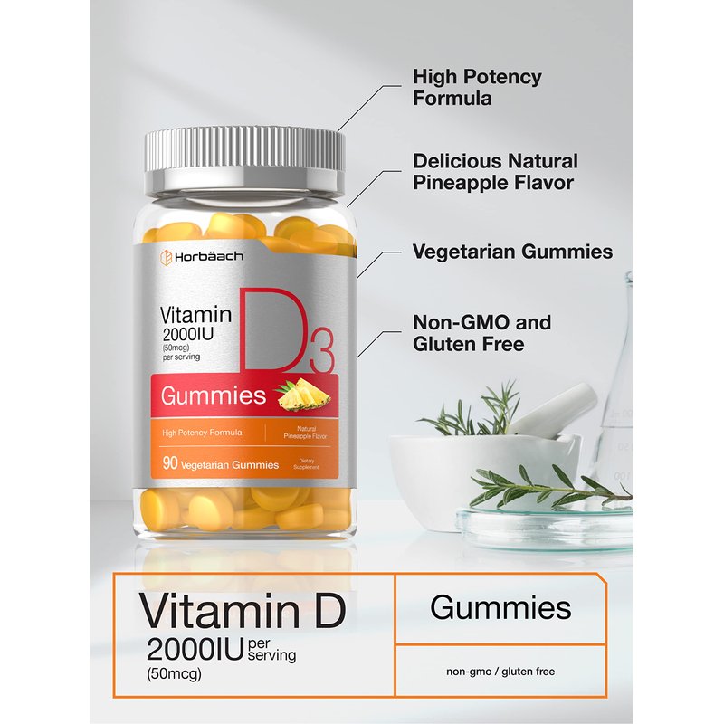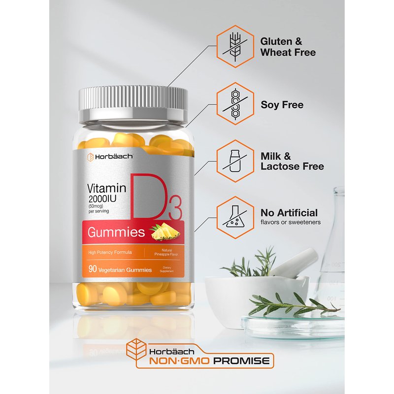 Vitamin D3 2000iu Gummies | 90 Count | Vegetarian | Pineapple Flavor | Non-GMO, Gluten Free Vitamin D Supplement | 50 mcg | by Horbaach