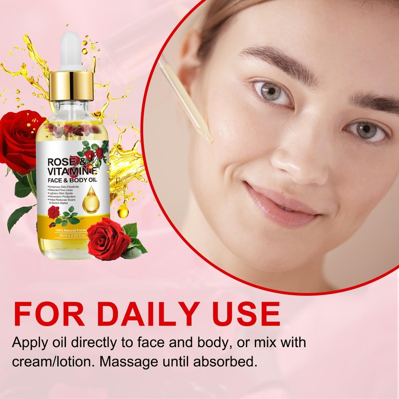 - MULTIPLE COMPONENTS: Unlock the secret to radiant skin with our Rose Vitamin E Face & Body Oil; This luxurious oil is rich in vitamins and antioxidants, making it the perfect elixir for achieving a healthy, glowing complexion