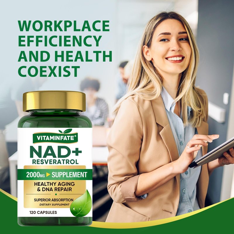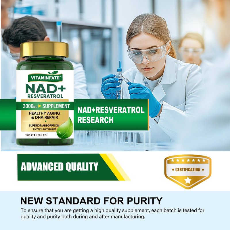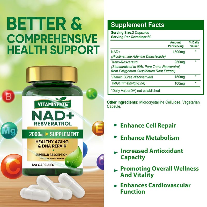 VITAMINFATE NAD+ Supplement 2000 mg - 120 Capsules True NAD+ & Resveratrol, NMN Alternative Supports Anti-Aging, Cellular Energy & Repair, Metabolism & Brain Boost for Men & Women