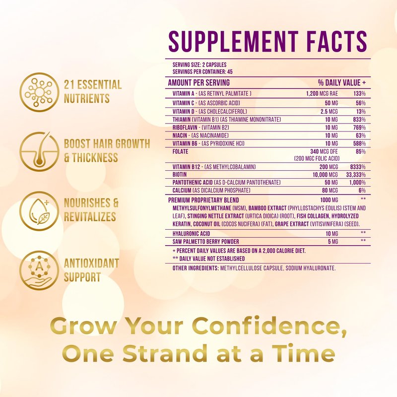 - BOOST YOUR HAIR GROWTH & CONFIDENCE at the same time. Healthy, lustrous hair is often admired and complimented, subtly enriching your everyday experiences. It's not just about vanity; well-nourished hair is a testament to your personal care and lifestyle choices. Our hair growth supplement helps you achieve radiant hair that will turn heads and invite compliments, making you feel appreciated and noticed in both personal and professional circles.