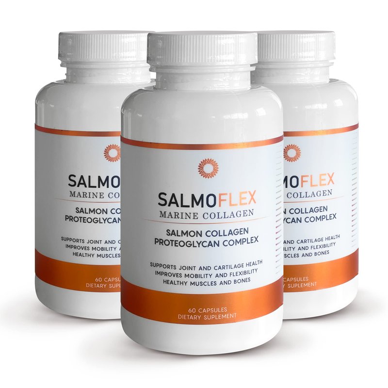 Salmoflex Marine Collagen supplement is a blend of hydrolyzed collagen complex naturally derived from salmon cartilage, proteoglycans, and essential vitamins including C, D, and E, along with hydrating Hyaluronic Acid. Our fish collagen capsules are rich in protein and amino acids. Our capsules support mobility, strengthen bones and also contain important ingredients for skin, nails and hair.