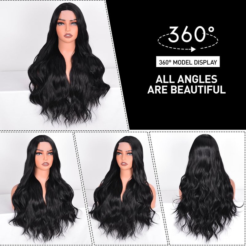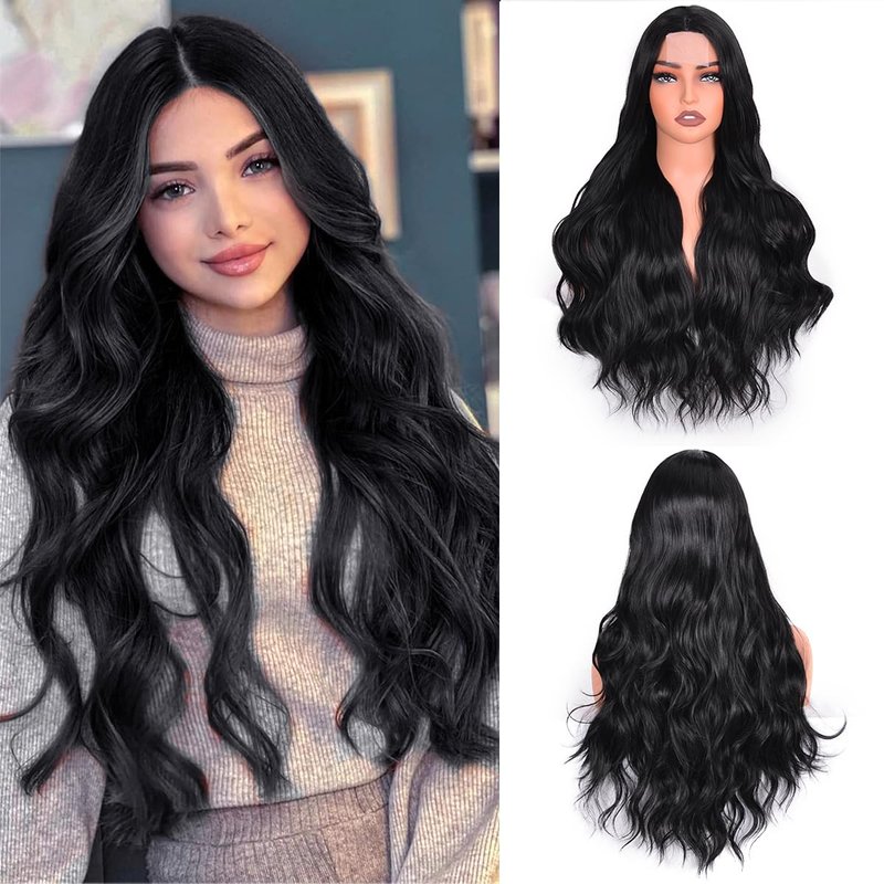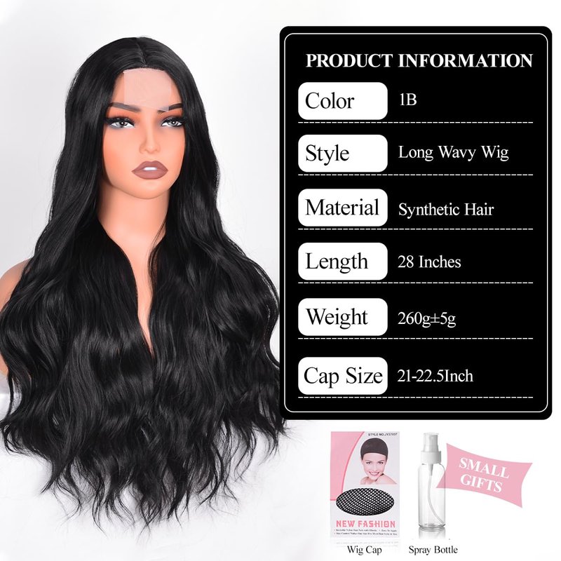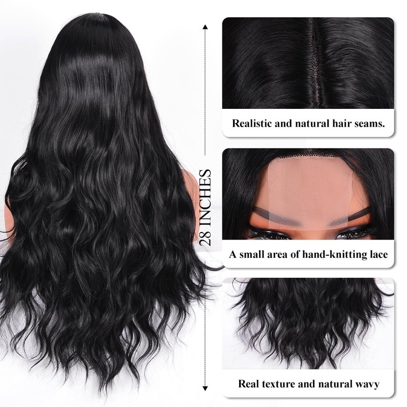 Vitorish Long Wavy Wig for Women, 28 Inches Middle Part Curly Wavy Wig Black Small Lace Resistant Fiber Synthetic Wigs for Daily Use (Black)
