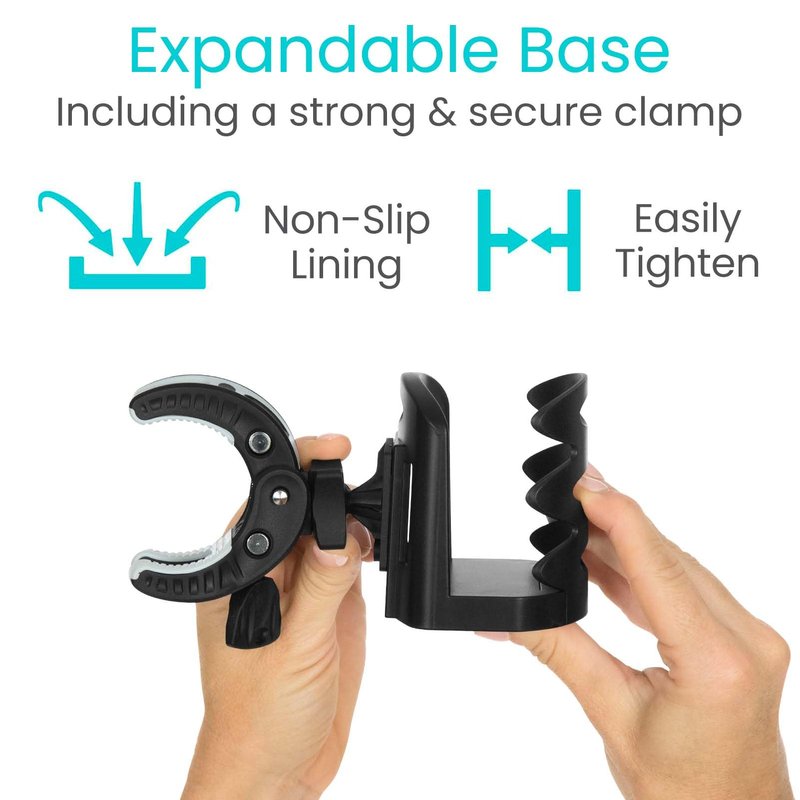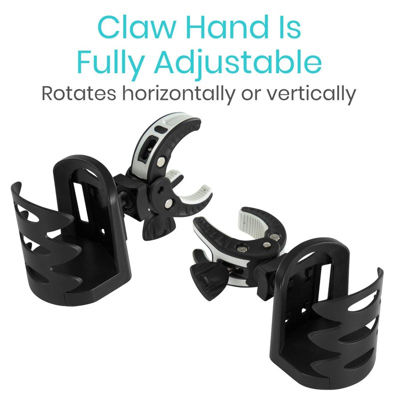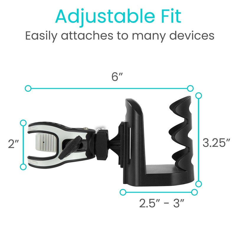 - VERSATILE AND UNIVERSAL FIT: Featuring a strong clamp mechanism and a swivel base, our durable Vive drink holder accessory easily attaches to any vertical, horizontal or diagonal bar on most mobility aids such as walkers, scooters, rollators, wheelchairs and canes.