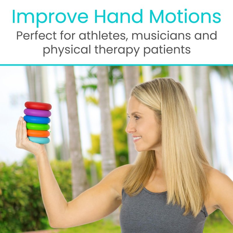 - STRENGTHENS GRIP AND IMPROVES DEXTERITY: Hand exercise rings build strength in the fingers, hands, wrist and forearms. Varied activities, including crushing, pinching and extensions work to improve the dexterity of both the fingers and hands. Perfect for athletes, musicians and physical therapy patients.