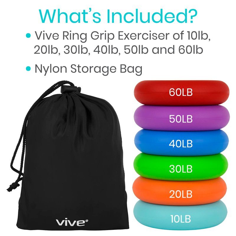Increase strength and improve dexterity with the Vive hand strengthener rings. Premium silicone rings offer three levels of resistance for gaining strength in the hands, wrists and forearms. The Vive hand strengthener rings are tear-resistant, quiet and odorless and are easily portable in the convenient nylon travel bag. Use to build strength following surgery, as a part of physical therapy or to improve as an athlete or musician. Product Features: Durable Construction, premium silicone rings are odorless and tear resistant Perfect Fit, sized to comfortably fit adult hands with a diameter of 3.45” Progressive Resistance, includes10 lb, 20 lb, 30 lb. 40 lb, 50 lb, 60 lb rings Builds Strength, strengthens fingers, hands, wrists and forearms Improves Dexterity, varied activities include crushing, pinching and extensions, perfect for athletes and musicians Included in your purchase: Vive hand strengthener rings: set of four Nylon travel bag Manual