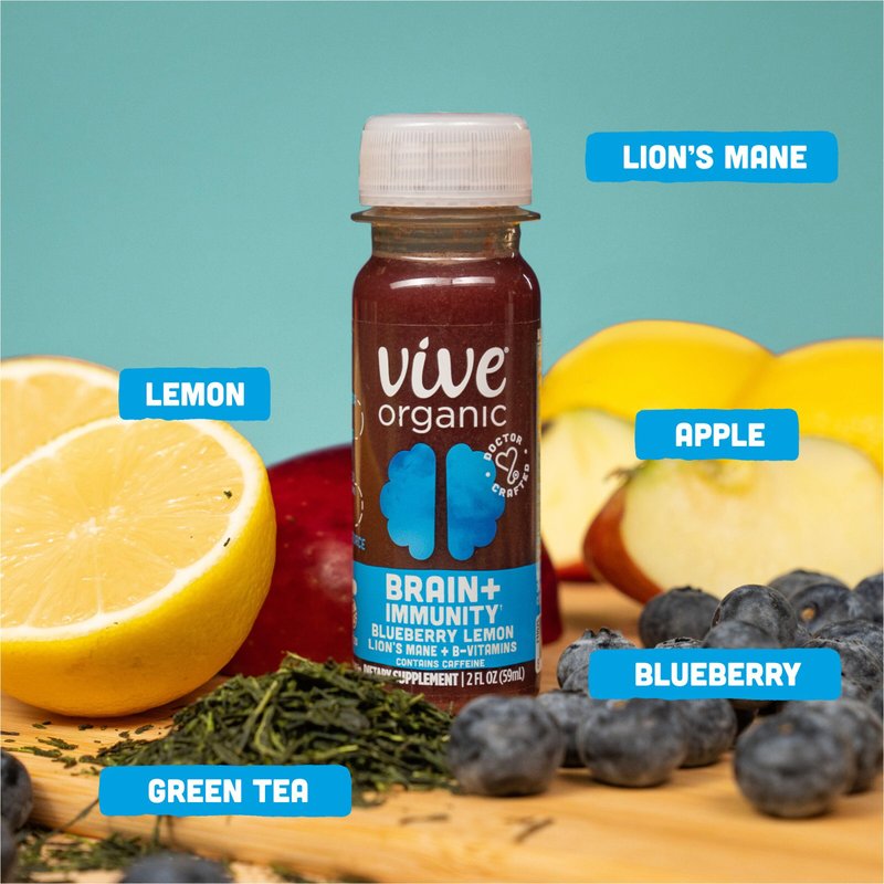 - 2-IN-1 BRAIN BOOSTER IMMUNITY SHOTS: Twelve 2 fl oz bottles of Vive Organic Brain + Immunity Blueberry Lemon Wellness Shot