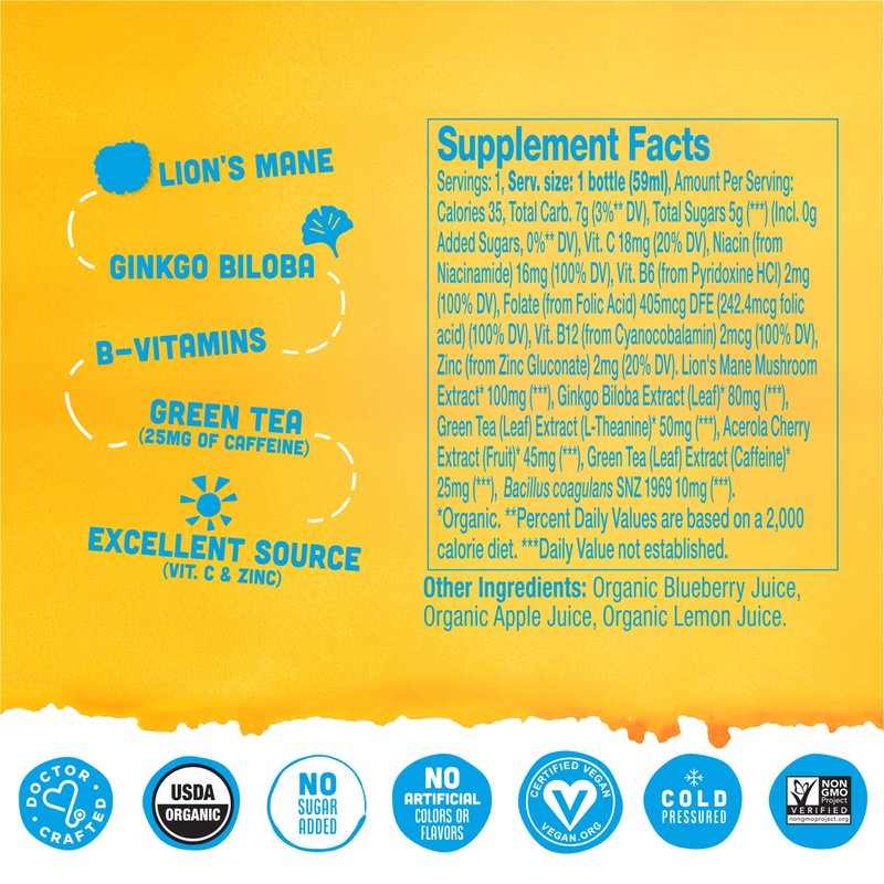 Vive Organic Brain + Immunity Wellness Shot makes proactive brain support and immune system support an easy part of your daily routine. Each 2 fl oz wellness shot gives you extra brain health support with omega 3 from flaxseed, caffeine, l-theanine, and vitamin B-12. These blueberry-lemon juice shots also contain an excellent source of vitamin C and zinc for immune support.