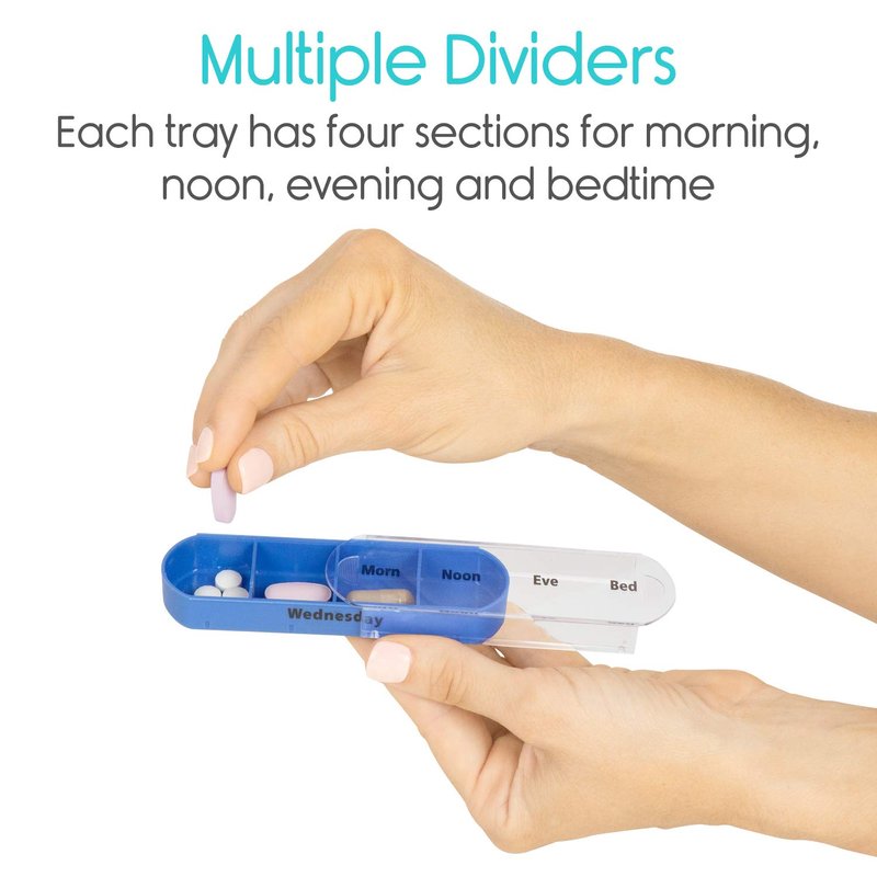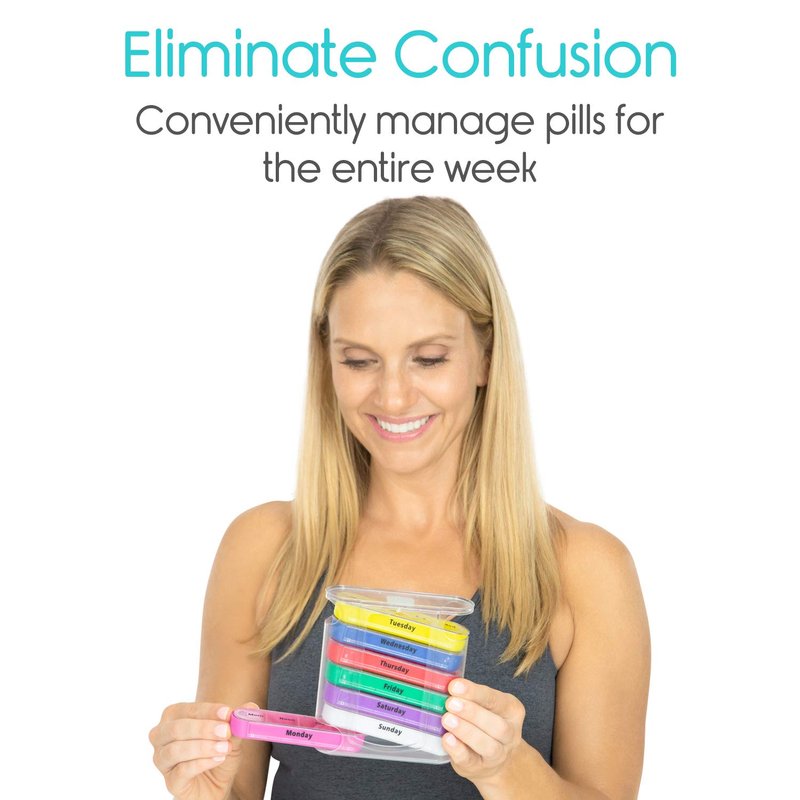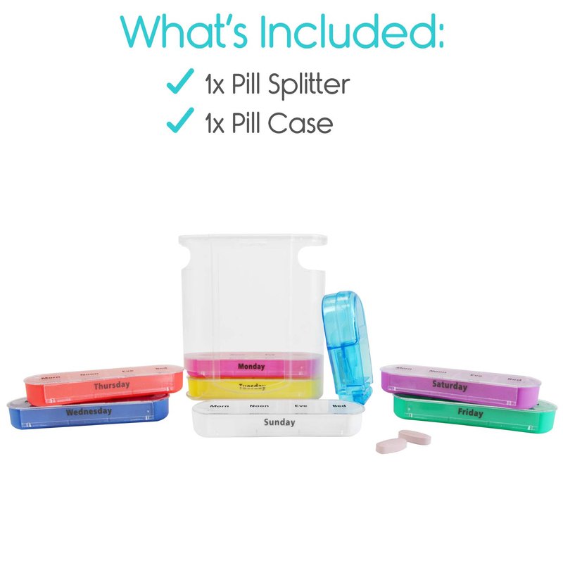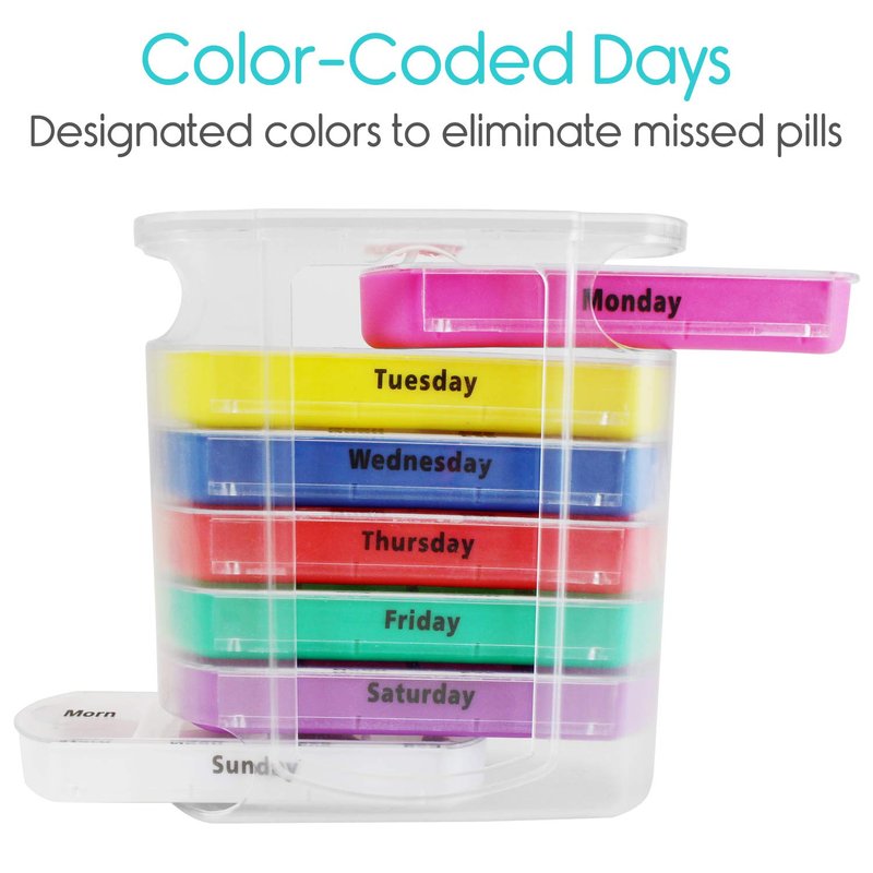 - ELIMINATE MEDICATION CONFUSION: Conveniently manage prescriptions, vitamins and supplements for the entire week. The pill box contains seven color-coded trays with sliding lids, one for each day of the week. Empty trays slide under the stack to ensure entire days are not missed. The set also includes a convenient pill splitter to halve large pills, making swallowing easier or under a physician's orders.