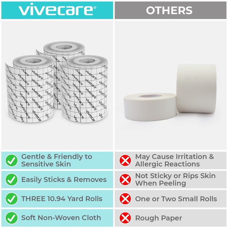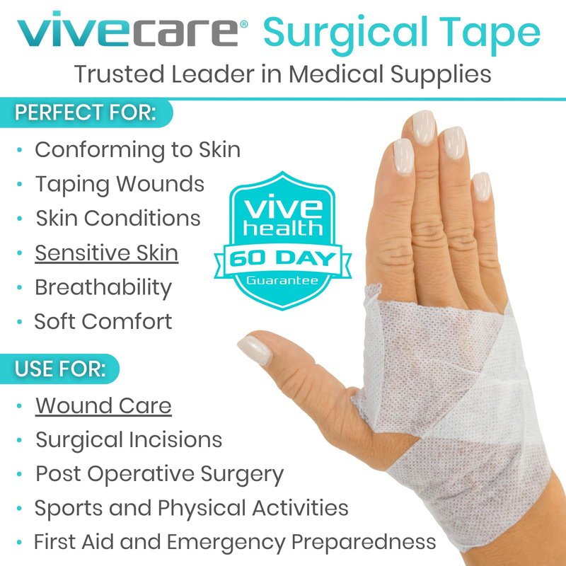 - SURGICAL TAPE FOR WOUND DRESSINGS: Secure gauze dressing pads with ease using Vive Care surgical tape, your go-to medical tape for wound dressings. Our reliable tape ensures your wound dressings stay firmly in place, making it perfect for incisions too. It's designed for easy application and removal, making frequent dressing changes a breeze.