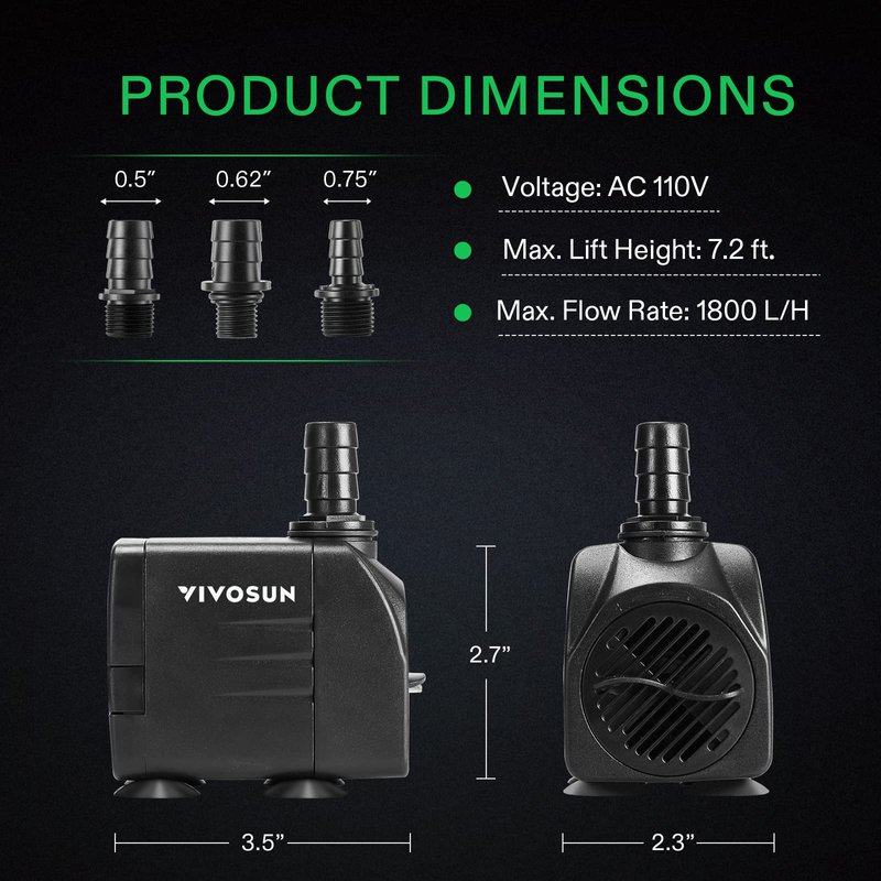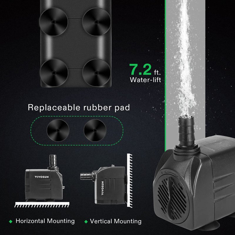 VIVOSUN 480GPH Submersible Pump(1800L/H, 25W), Ultra Quiet Water Pump with 7.2ft High Lift, Fountain Pump with 5ft Power Cord, 3 Nozzles for Fish Tank, Aquarium, Statuary, Hydroponics