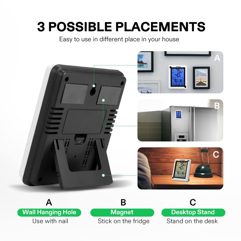 - Hands Free Monitoring: Connect up to 3 strong signal penetration humidity sensors to get the temperature and humidity records from 200ft/60m remote range away (enhanced Wireless Frequency: 433 MHz); Tabletop or wall-mountable design; Powered by 4 x AAA battery (included)